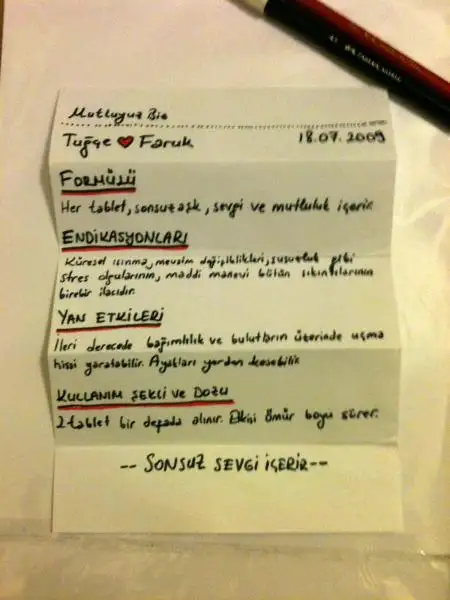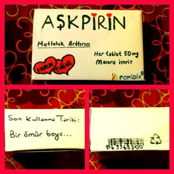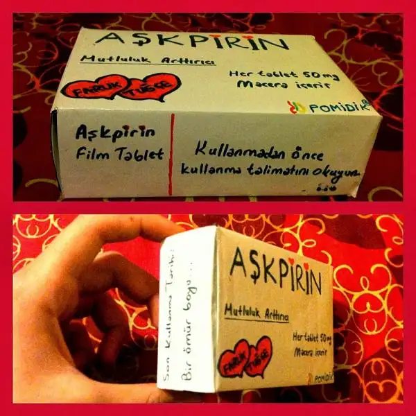 İlaç kutusunu elişi kağıdıyla kapladıktan sonra keçeli kalemlerle sanatınızı konuşturuyor ve ilacımızı tasarlamaya başlıyoruz. Aşağıda benim sevgilime hazırladığım aşkpirin sürprizimi sizler için fotoğrafladım. Ben biraz coştum ve tıpatıp bir ilaç kutusu yapmaya çalıştım ama isterseniz sadece önyüzünü de yapabilirsiniz. Yada ben sabredemiyorum zamanımda yok derseniz aşağıdaki linkten hazırını alıp hatta sevgilinizin evine kargolatıp verebilirsiniz. Sevgiliniz kargo gelince hediyesini aldığında yine şaşıracak ve onu düşünmenize sevinecek sürprizinizi yine yapmış olacaksınız."