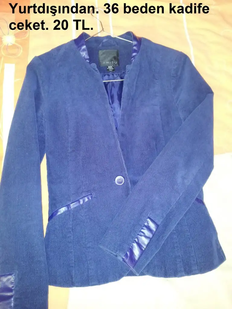 Lacivert fitilli kadife ceket. Geçen sene yurtdışından almıştım. Deri detayları var (suni deri). Az giydim. Hiçbir deformasyonu solması vs yok. Kalıbı çok güzel, ve rahat bir ceket. Artık laciverti hayatımdan çıkarıyorum, o yüzden satışta:)