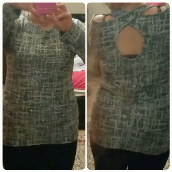 Gri kazak.pencere detayi omuzlarinda.hafif uzun