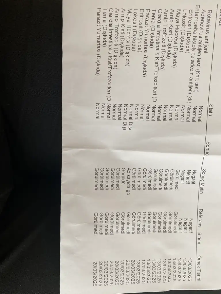 Yaa anlamıyorum ki geçen sadece lökasit kalmıştı diğerleri begatğfti isgal devam edince dün bir daha verdik tekrar amip kisti çıktı tekrarlayıp duruyor5 aylık olacak 4 aydır hiç bir mukus vs yoktu bu amip bulsştıktan sonra artık geçmedi 20 gün olacak hala düzelmedi