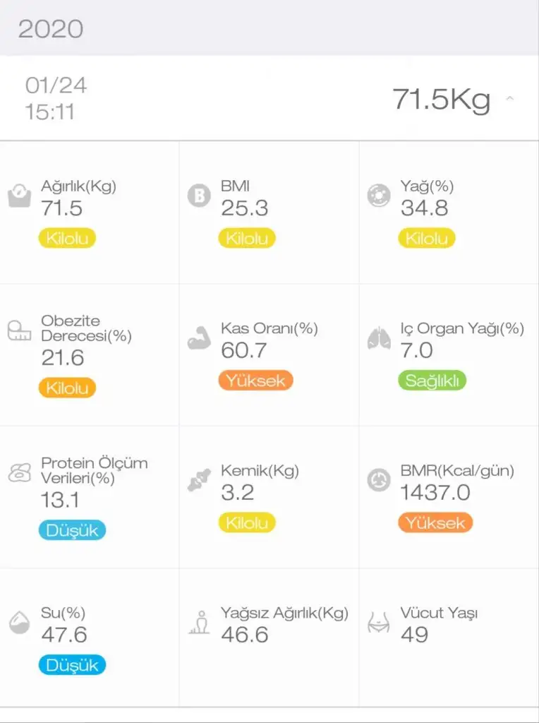 değerlendirmemde başarılı buldum kendimi kas oranımı %2 oranında , su ve protein oranımı %1 oranlarında arttırmışım.yağdan %2 vermişim. bu da demektir ki aslında verdiğim kilo daha fazla ancak kas ağırlığım artınca az kilo vermiş görünüyorum.iç organ yağımda %7,5 tan %7 ye düşmüş vay be harika cidden kendimle gurur duydum.