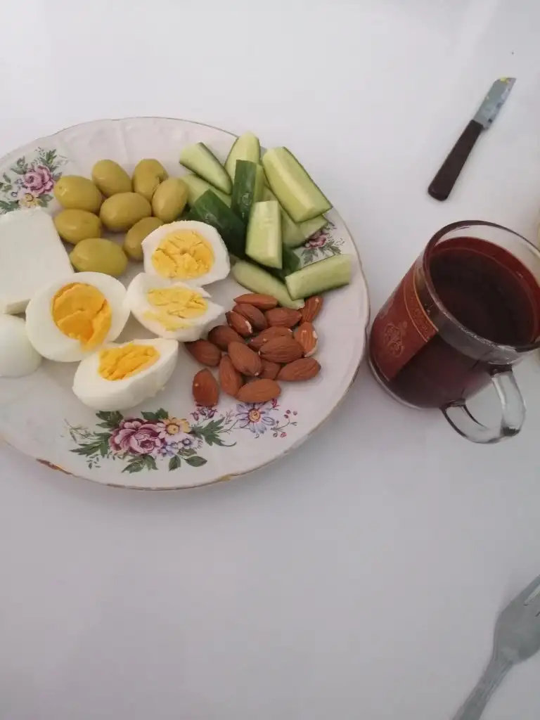 2 yumurta pirasa ve lorla omlet 3 siyah 2 yesil zeytin marul maydanoz domates 2 dilim kadar taze ev ekmegi cay