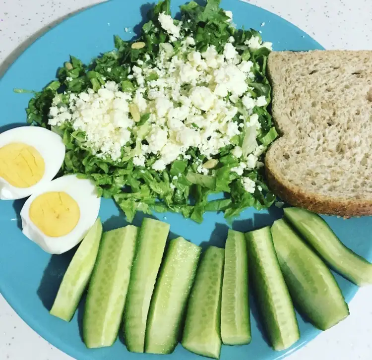Sabah bir yumurta, 30 gr peynir, beş zeytin, domates, salatalık, dereotu, biber, iki dilim pastırma, iki dilim ekmek