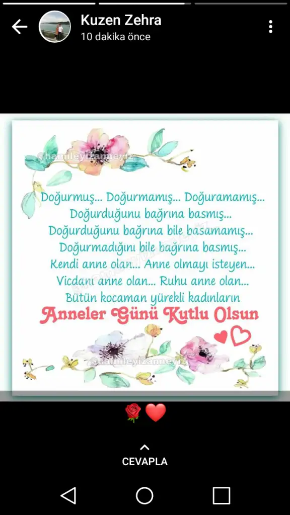 Canim kendi adima guzel mesajina cok tesekkur ederim.Herkese selam,senin mesajin araciligiyla hepinizin anneler gununu kutlarim,eminim tarif edilemez bir duygudur