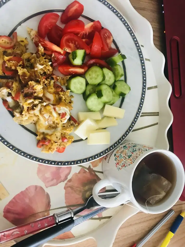 Öğlen: sucuklu yumurta, peynir domates salatalık ve 1,5 dilim ekmek 1 çay