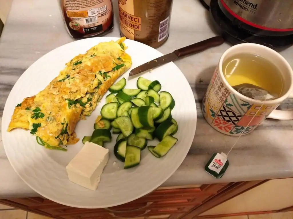 Oglen: 2 yumurtayı 1 kasik tere yaginda pisirdim, salatayla birlikte yedim.
