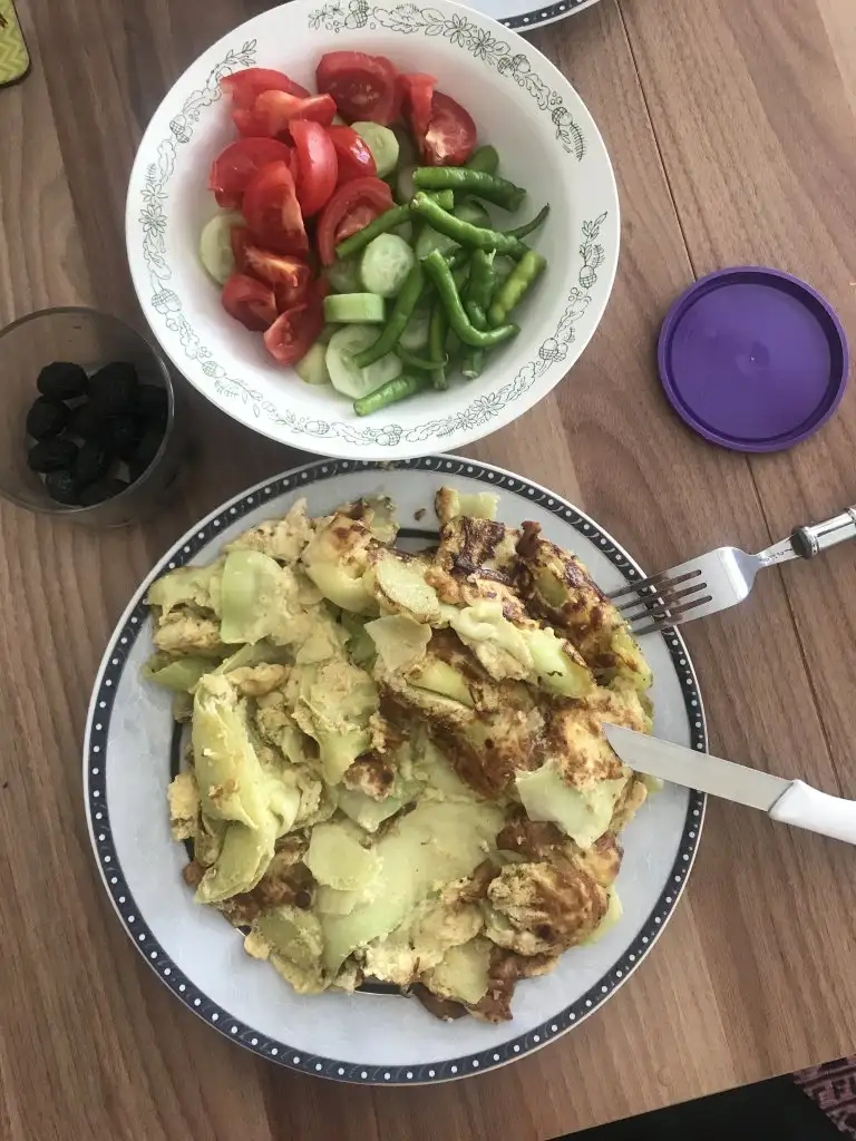 Kabaklı ve 4 yumurtalı omlet yaptım. Yaklaşık 90 gr da lor var içinde.