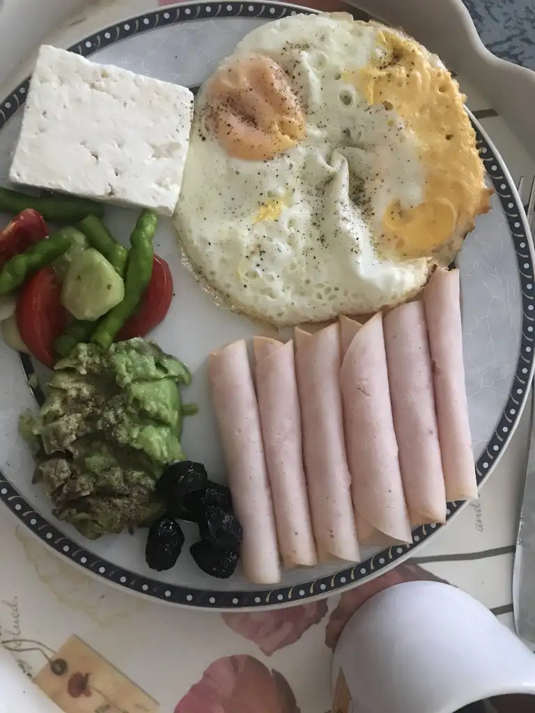 Salamli omlet (2 yumurta, 2 parmak kalinliginda dana salam), sögüs domates, salatalik, pancar (yarim), avokado (ceyrek), siyah zeytin (7-8) ve papatya cayi