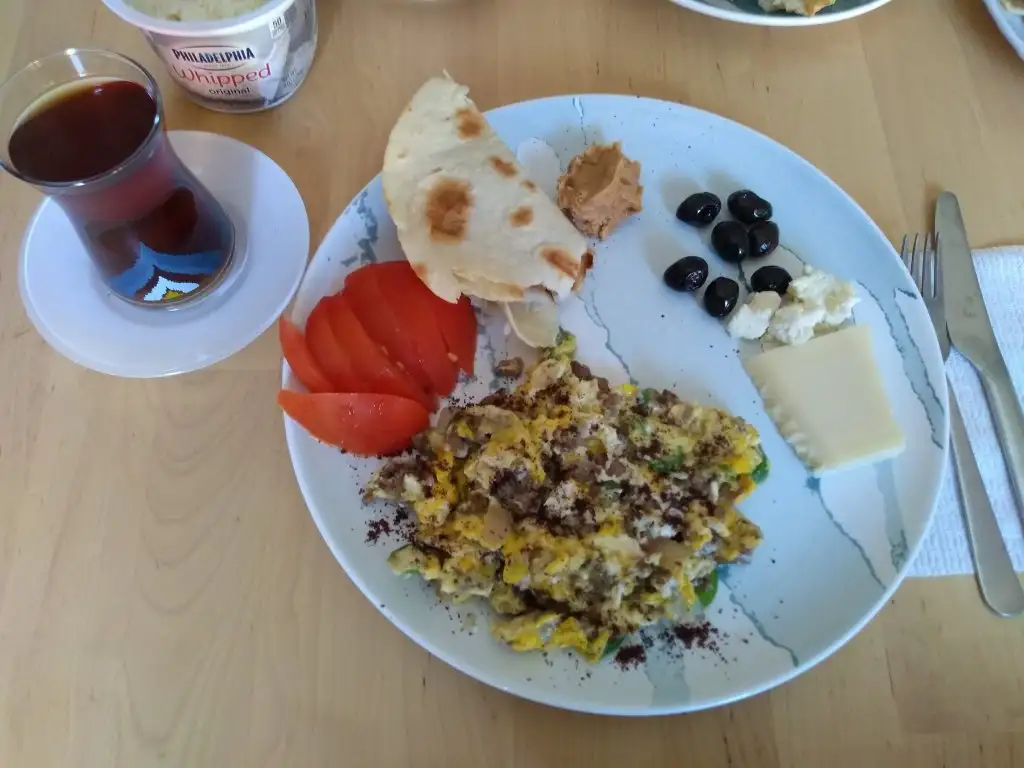 SABAH 9DA (Kiymali , biberli 2 yumurta, peynir, zeytin, domates, fistik ezmesi ,70 kalorilik tortilla)