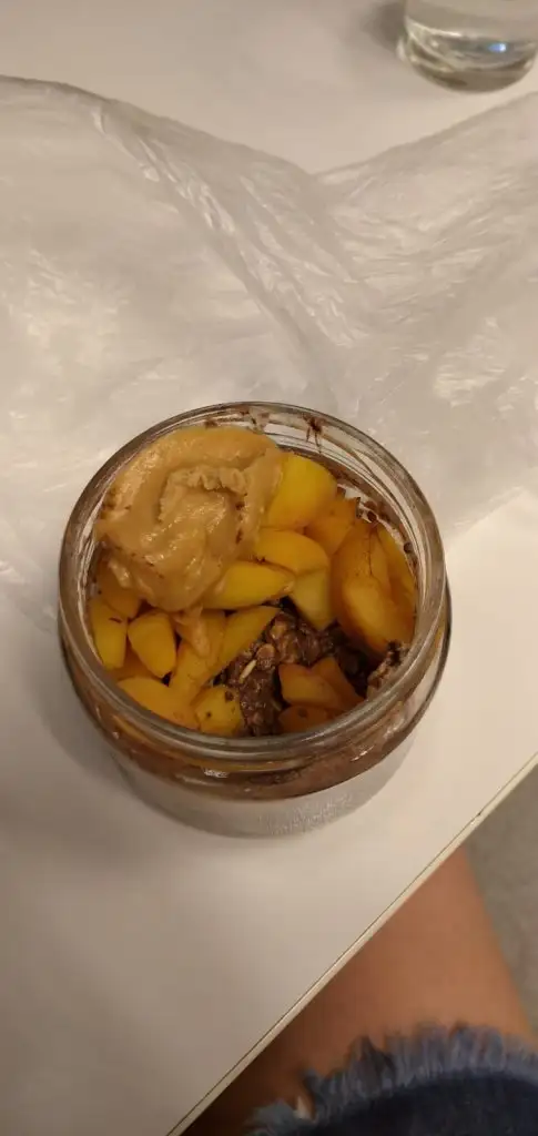 4 yk yulaf + 4 yk süt + 1 yk yoğurt + 1 çk chia + göz kararı kakao ve tarçını karıştırıp geceden dolaba koydum. sabah çok katı duruyordu. üzerine 2 kayısı doğradım ve 1 tk fıstıkezmesiyle nokta koydum.