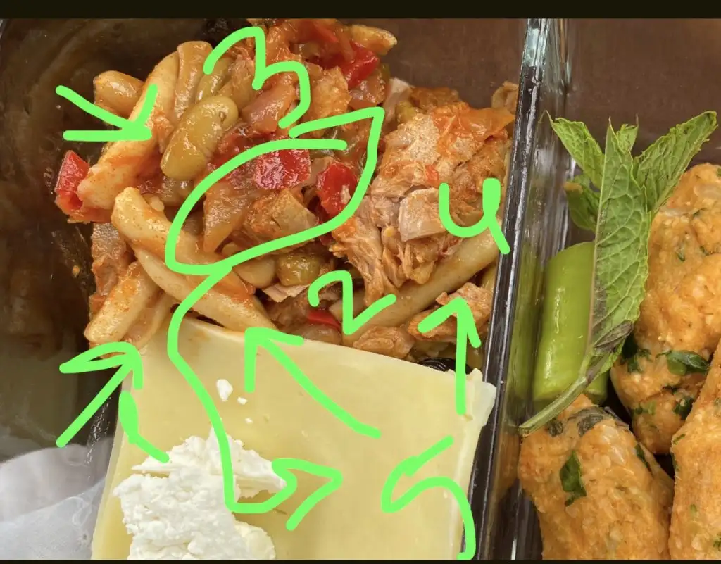 2 kaşıkcık ton balığı salatası gibi bişey (içinde bir kaç makarna tanesi de vardı)