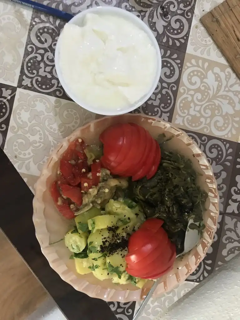 Pattis domatiz kabağı sağlıklı olması açısından fırında kızartıyoruz. Amaan yapalım bir hovardalık dersen yağda kızartıyoruz 😬 üstüne yoğurt ve biraz ateşte çevrilmiş sarımsak+domates koyyoruz. Yanına da beyaz peynir çay. Kaptan beni atar mı sence gruptan 😶