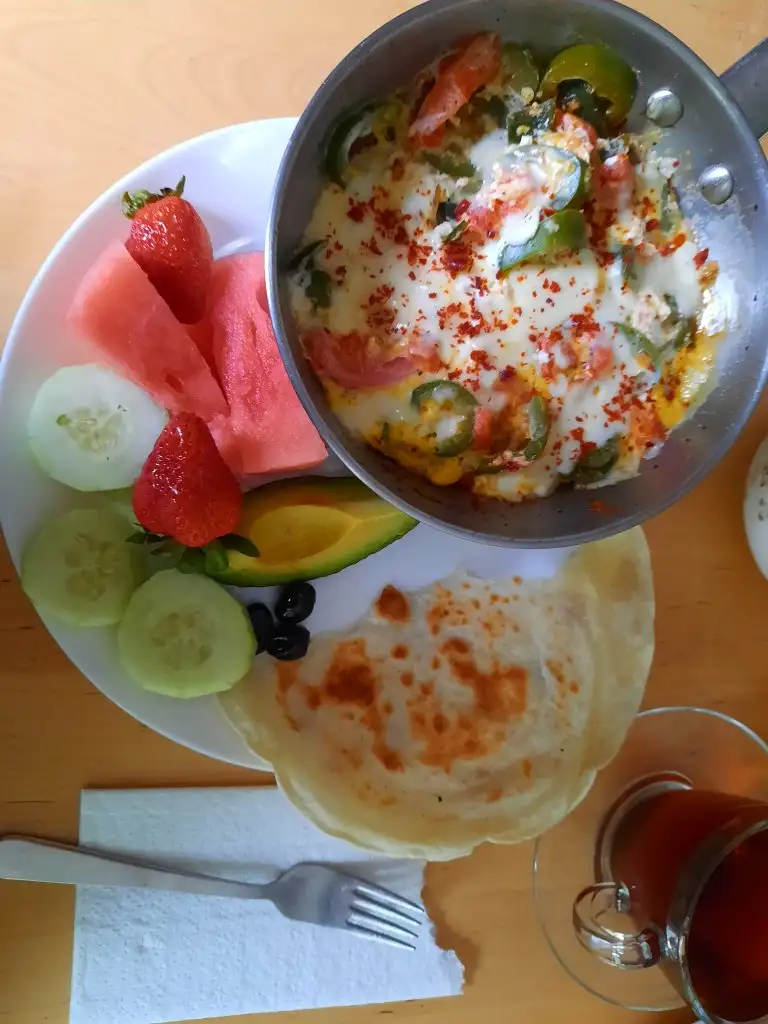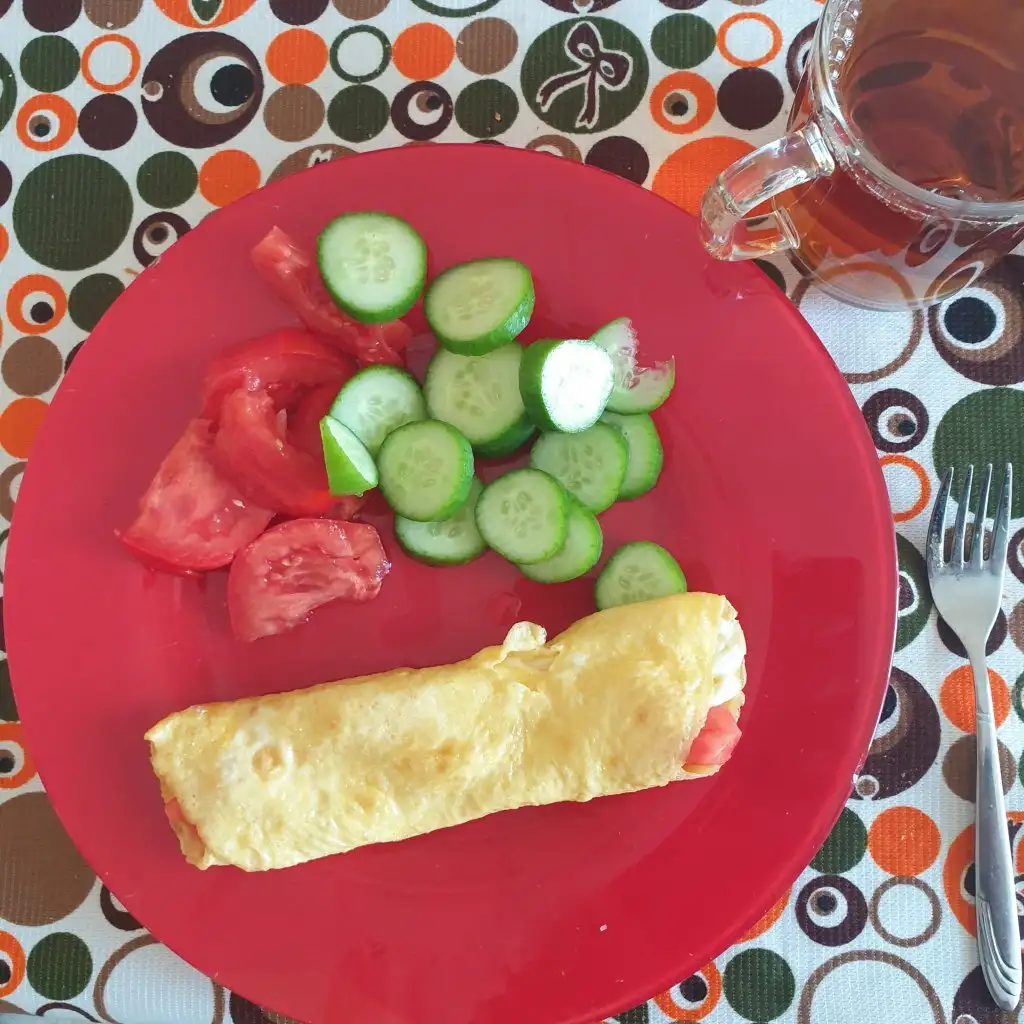 Omlet (2 yumurta, bir dilim salam, 7-8 siyah zeytin), sogus domates, salatalik, kapya, avokado ve ayran