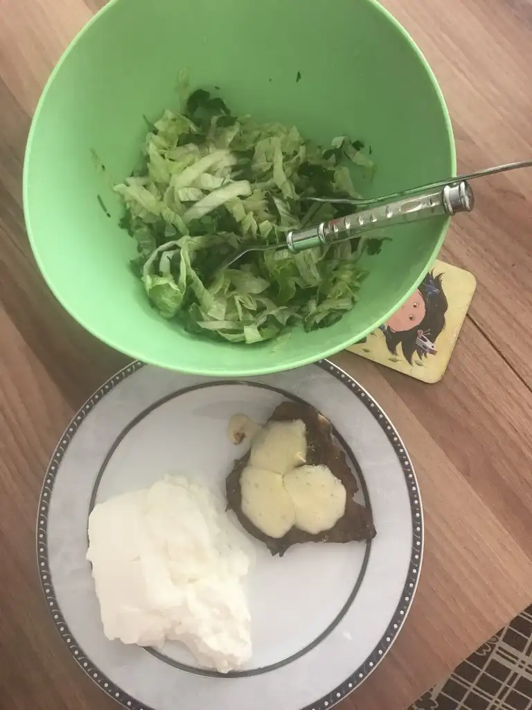 bugün ilk öğünüm salata, et sote, ayran