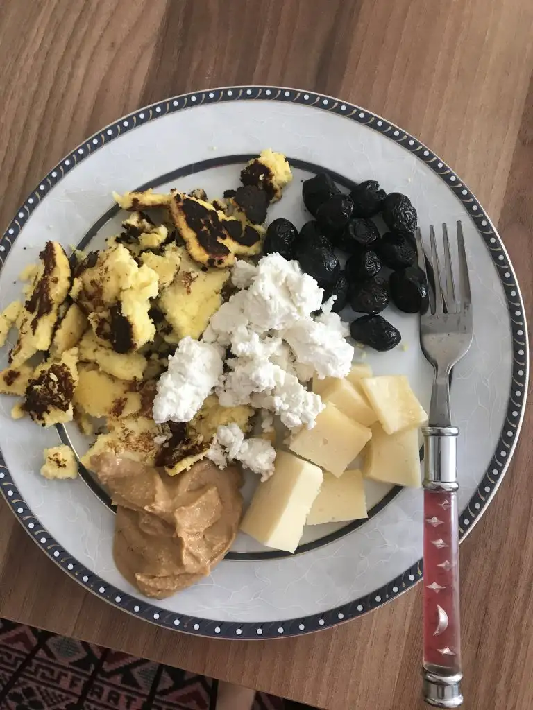 devaminda 1 hurma, 1 kuru kayisi, 1 minik yudum elmali kek (esim istedi yaptim, tadina baktim sadece), bir kucuk parca ekmek kiyisi ile peynir (bunu da taze ekmek yaptim dayamadim)