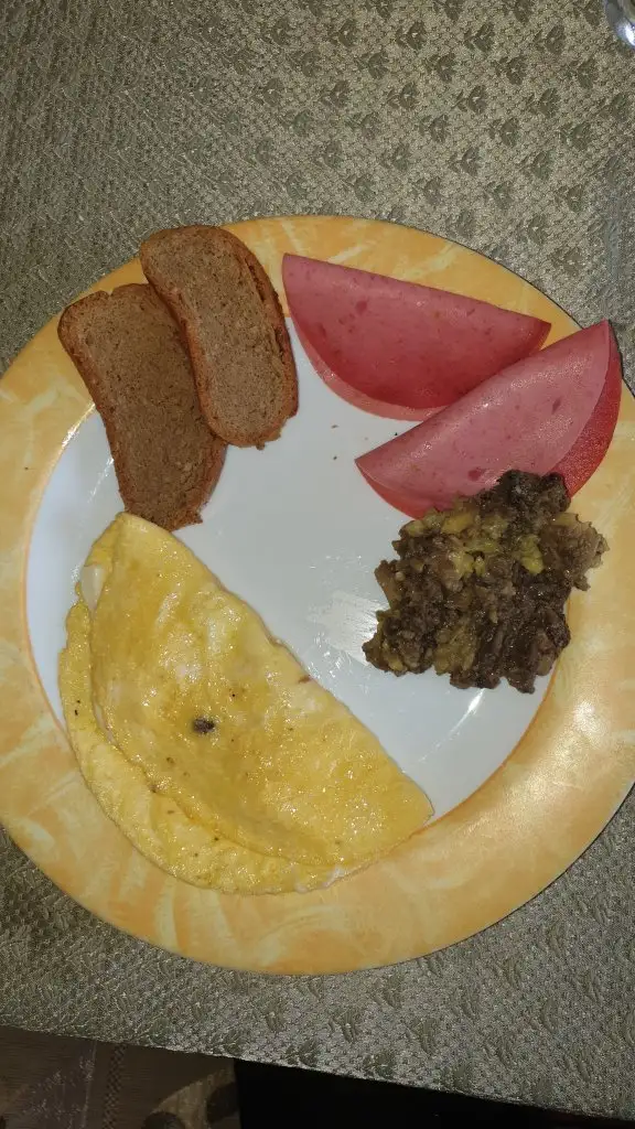 Sabah: 2 yumurtadan omlet, 1,5 yk patlican acı biber domates soslu kahvaltılık 1,5 dilim ekmek