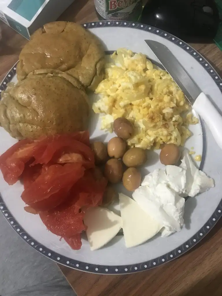 kahvaltı tabağındaki ekmekcikler yumurta-tahin-tuz-kabartma tozu karıştır fırınla. Ya da pankek gibi pişir.