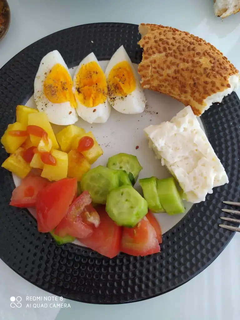 1haşlanmış yumurta, 1 dilim beyaz peynir, domates, 1,5 dilim kızarmış ekmek
