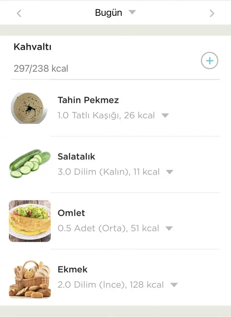7 zeytin, 1 haşlanmış yumurta, 2 dilim peynir, 1 ceviz, 5 fındık, salatalık, yesillik