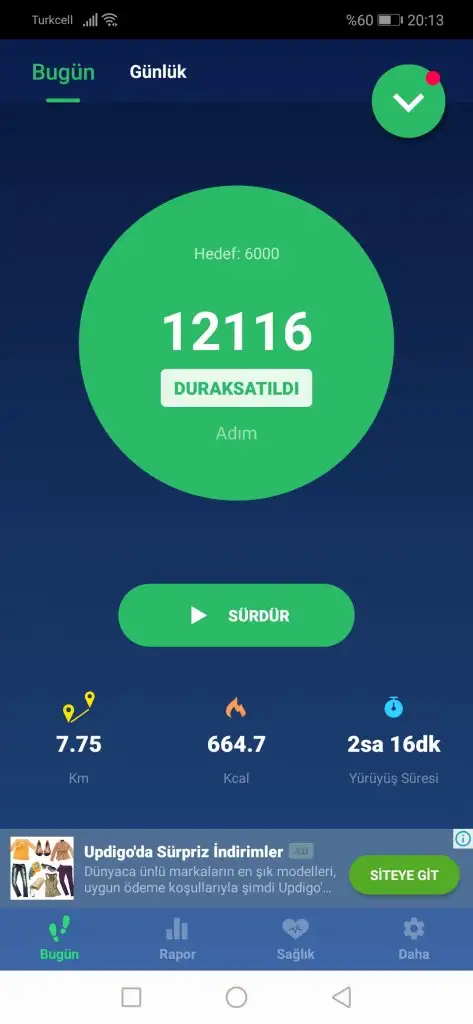 Canim adım görselde 6039 gözüküyor eksik mi yükledin acaba fotoğrafı ?Merhaba :) 1400 kalorimi doldurdum kahve ve su dışında bisey icmiycem artık.. Yediklerimi atıyorum spor dünden fazla yapmak istiyorum ama bugün hiç enerjim yok 11.500 adimdayim şimdi kendimi zorlaya zorlaya yaptım. Enerjim gelirse biraz daha yapmak istiyorum bakalım.
