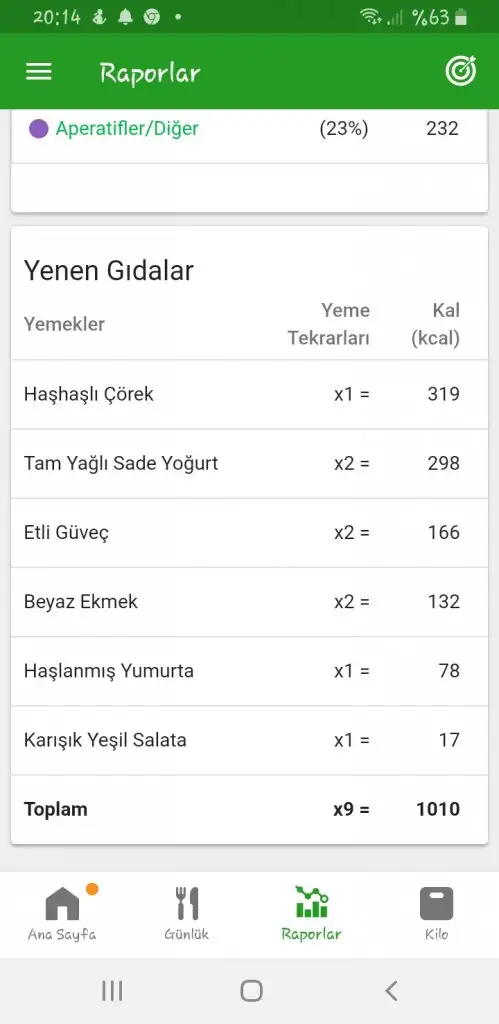 Cok az yiyorsun canim senSpor : 45dk Leslie(315 puan)25 tane mekik(50 puan) 10 dk zumba(70 puan) toplam 435
