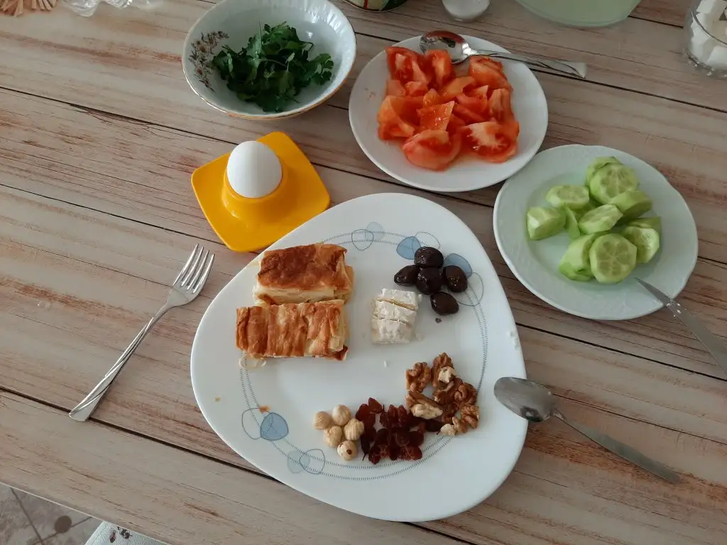 2 küp kaşar peyniri, 1 küp beyaz peynir, 4 zeytin, 10/12 sap maydanoz, 1 dilim pastırma, 1 haşlanmış yumurta, 2 küp tahin helva, limonlu şekersiz çay