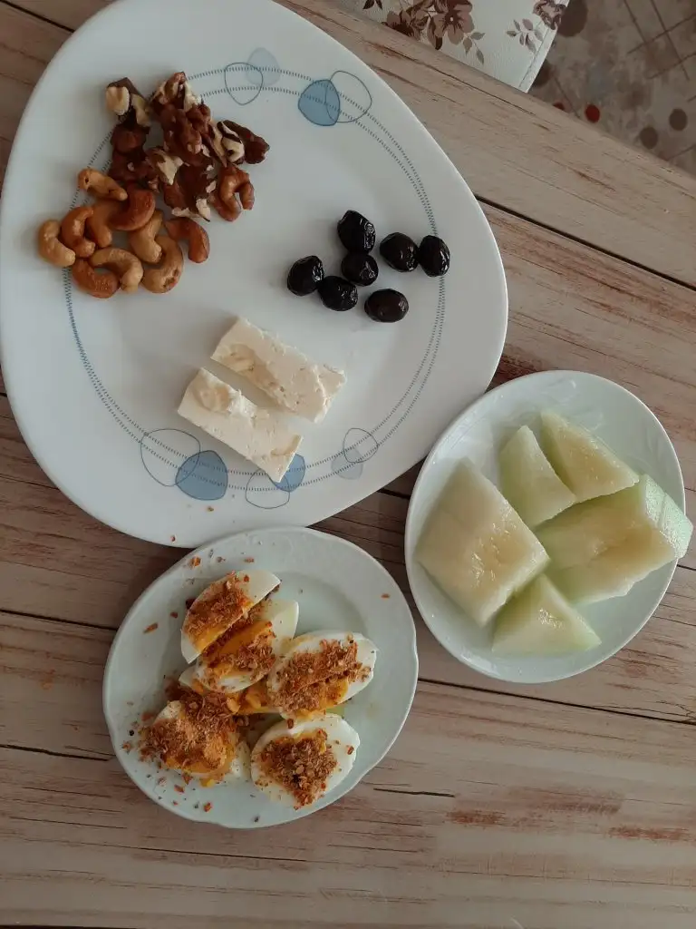 Kahvaltı 1 muz ve çilekli 3 kaşık granola üzerine 1 kaşık tahin ile erken yemiştim sonra 1 yumurta 3 zeytin yedim