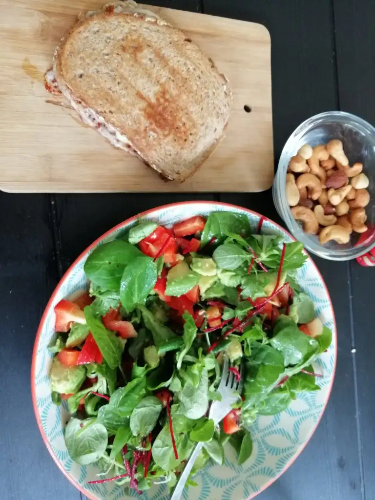 30 Gr sepet peyniri+ 3 çeri domates ile yulaf tostu, 5 zeytin, salatalık, marul, kapya biber, yeşil biber, 1 tatlı kaşığı tahin+pekmez