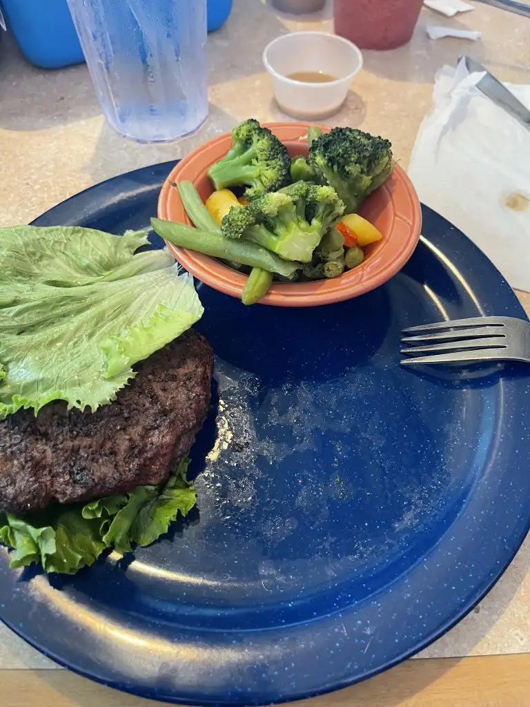 İki marul yaprağı arası hamburger köfte, haşlanmış sebze.