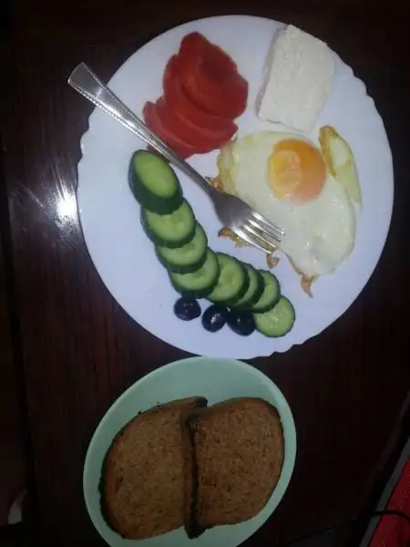 sabah: domates salatalık, 1 kk beyaz peynir, yarım kk kaşar, 1 kaşık cacık, 1 minik fırında börek, 1 küçük poğaça, bolca çay