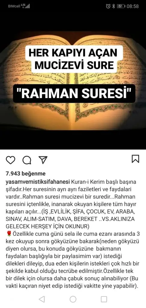 Kizlar, bugun cuma.. Rahman süresini musait olanlar sela ile ogle namazi arasında 3kere okusunlar cok etkili olduğunu düşünüyorum sizrle ekran resmini de aldım vakti olanlar yapsın bende ogle arası işteyım ama yapıcam nasipse. Öpüyorum hepinizi.