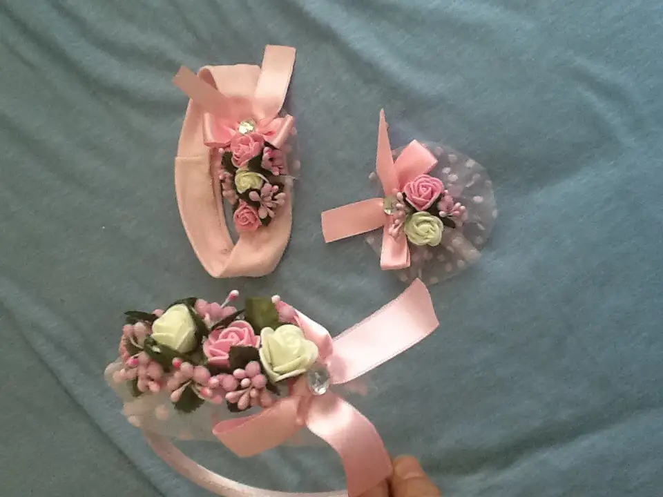 Merbalar, bende böyle bir takım var, lohusa tacı, aynı model bebek bandı ve yine ayno model iğneli broş. Hiç bir lekesi bızulmadı yok. Sadece hastanede fotoğraf çekiminde kullandım. Fiyat 15 tl