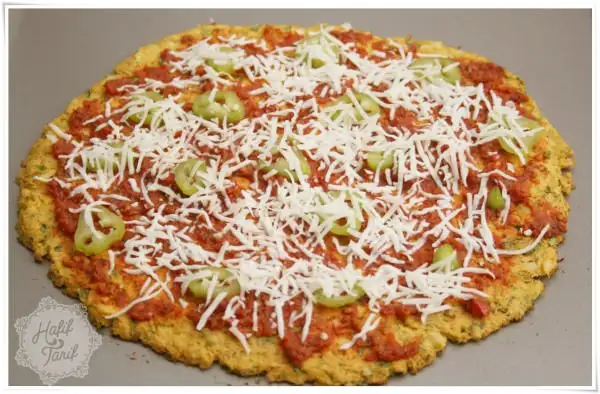 Yağ ve un içermeyen bu lezzetli pizza, dilim başına ortalama 100 kcal içermektedir. Karnabahar çiçeklerine ayrılıp 15 dakika kadar haşlanır (mikrodalga poşeti ile mikrodalgada haşlanırsa çok fazla sulanmayacaktır ) Pirinç halini alıncaya kadar rondodan geçirilir. Bir kabın içine sarımsak, 1 yumurta, tuz ve baharatlar ile karnabahar eklenerek hamur gibi yoğrulur. Yağlı kağıt konmuş bir tepsinin üzerinde pizza şekli verilir. önceden ısıtılmış 180 derece fırında rengi biraz değişinceye kadar ( 20 dakika kadar) pişirilir. Pizza tabanı pişerken 2 domates rondodan geçirilir. Küçük bir tencerede domates, salça ve baharatlar pişirilir. Pizzanın üstü için seçilen peynir ayrı bir kaba rendelenir. Pizza tabanı fırından çıkartıldıktan sonra, domates sosu tabana yayılır ve üzeri rendelenmiş peynir ve isteğe bağlı malzemeler ile (biber, sosis, zeytin vs ) süslenip tekrar fırına verilir. Bir 15 dakika daha fırında piştikten sonra servis edilir.
