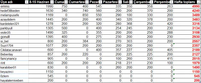 Kızlar bu haftaki ortalamamız pek iç açıcı değil maalesef. Nota alıyoruz. Bayram dönüsü olması sebebiyle cok üzerinde durmuyorum ama ileriki haftalarda ilk 3'e girip notamızı sildirmemiz gerekecek ona göre.