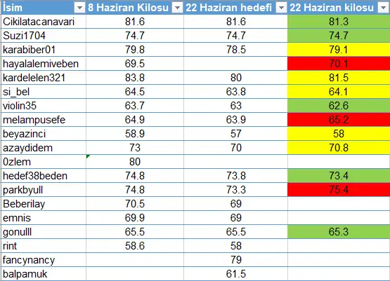 Yeşil hedefini tutturanlar, sarılar hedefini tutturamayıp kilo verenler, kırmızılar ise kilo alanlar