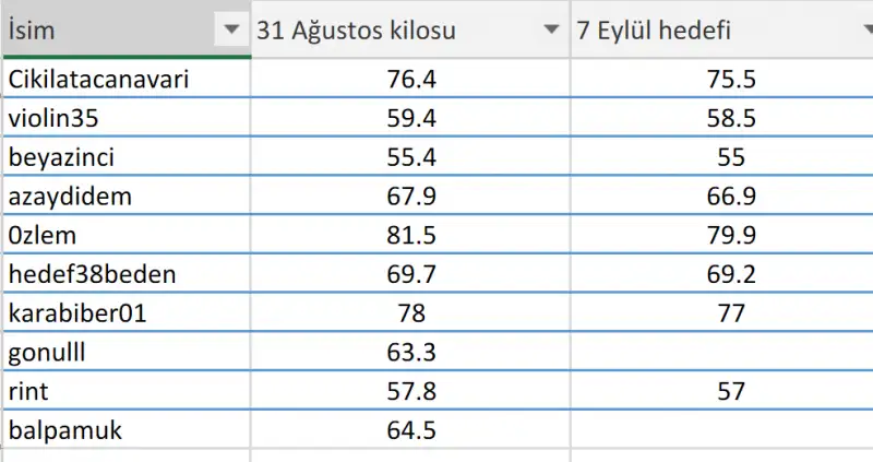 Bu arada hedef kilosunu belirtmeyenler bana yazsın. Gruplama işine de biraz daha sonra girelim diyorum.