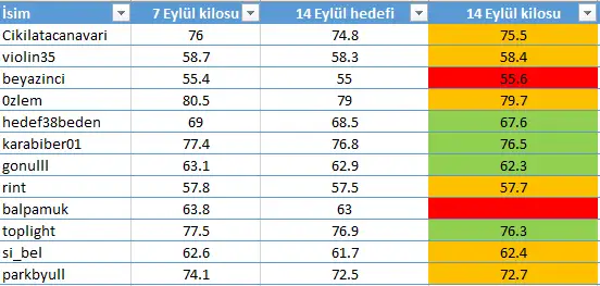 Hedef listesini paylaşmamışım meğer. Yeşiller hedefi tutturanlar, turuncu kilo verip tutturamayanlar, kırmızılar ise kilo alanlar (ya da kilo bildirmeyenler diyelim :) )