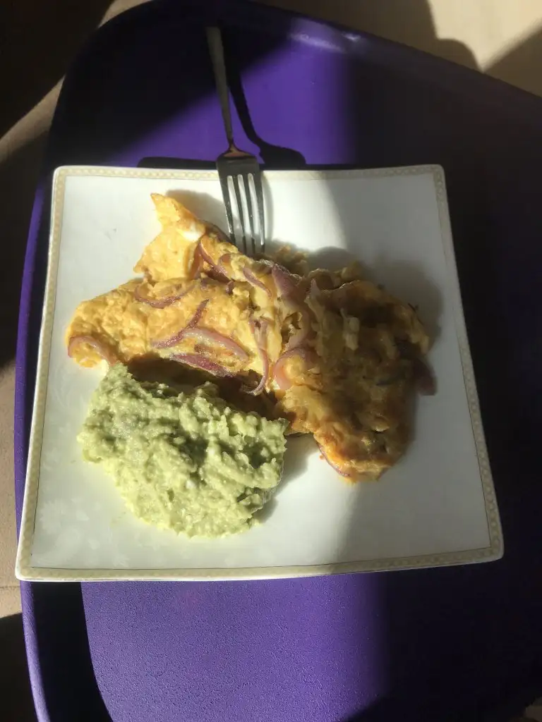 Yumurta pek sevmem ama işin içine soğan girince bi deneyesim geldi. Afiyet olsunVe bu sabah ki kahvaltım. Mor soğanlı omlet ve avokado-peynir-zeytinyağı karışımı.