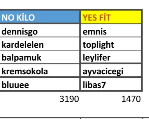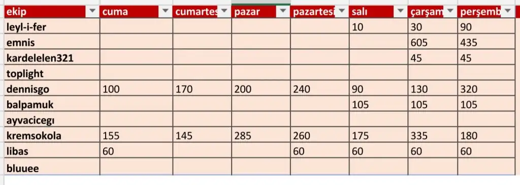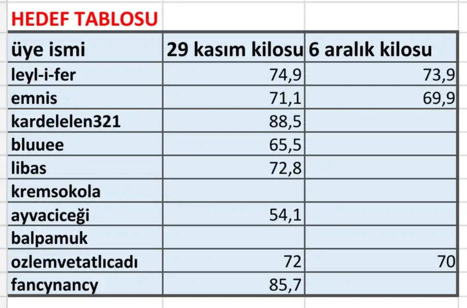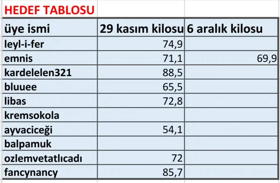 Ben şöyle bir tablo yaptım herkes 1 haftalık hedefi için dönüş yaparsa eklerim :rapci: