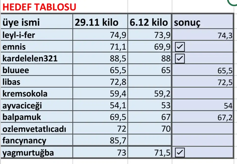 glsmhmt ( 56,8/56,4/0,2/%0,7)başlangıç tarihi 01 Aralık,başlangıç kilosu 56,8 , hedef kilosu 50