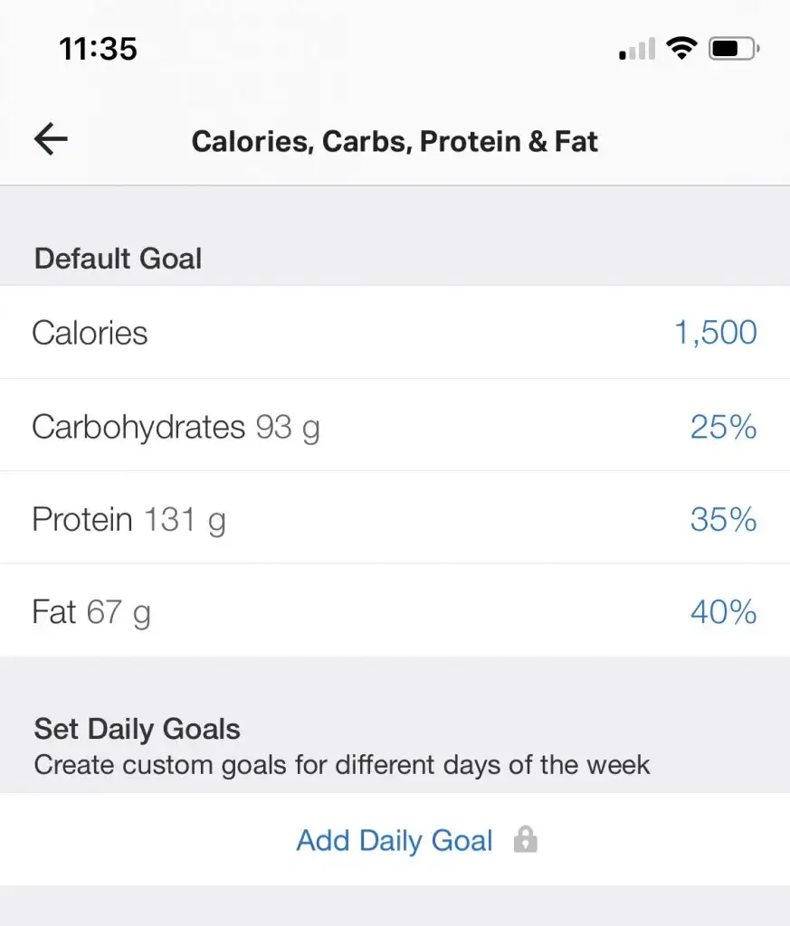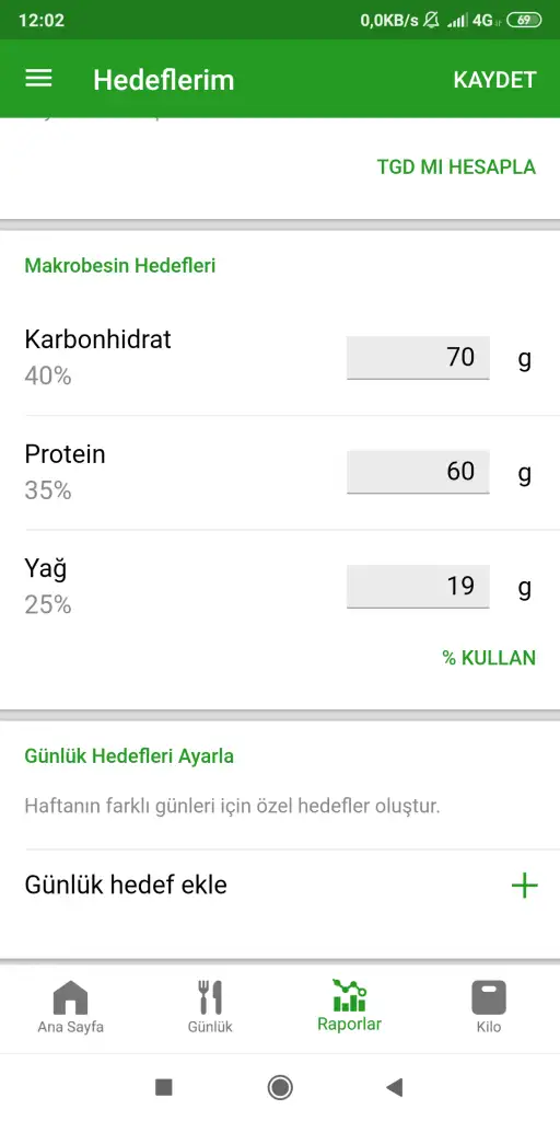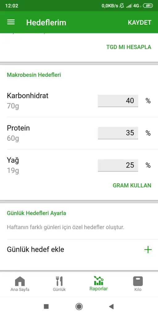 Vücudunuzun yağ oranını hesaplayacaksınız yağ oranına göre boy ve kiloya göre hesaplamalar çıkıyor. Benim 153 gr karbonhidrat 153 gr protein 30 gr yağDün geceden beri bin tane siteye girdim baktım her yerde farklı hesaplama çıkıyor kimi boyuda baz alıyor kimi yaşıda alakasız oranlar çıktı. Bu attığım uygulamada Gr olarakta gösteriyor işin doğrusunu bulsaydım manuel girecektim hedefleri ama bulamadım