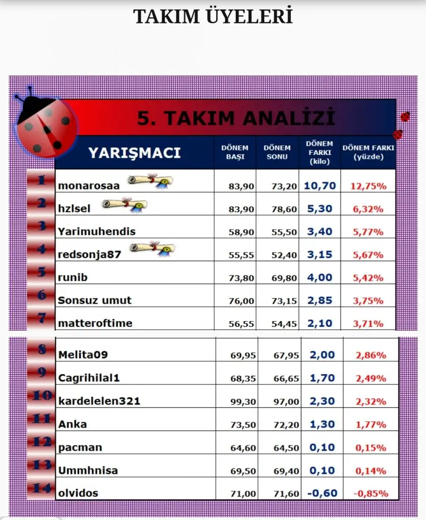 Üç cocuk tan sonra 57 olan kilom 98 e çıktı. Evde kendi çabamla 88-89 a kadar düştüm sonrası farkettim ki benim motivasyona ihtiyacım var ve böyle tek basına zor. Sonra burayı keşfettim ve başladım 88.7 kg ile 2017 ye kadar olan sürece kadar 55 hatta 54 kg ile mezun oldum. Uzun zaman kilomu muhafaza ettim taki oğlumun ameliyatına kadar stres ve sürekli uzun yolculuklar ile çığırından çıktı ve 72 kg a kadarr çıktım. 10 gün evvel yeniden diyete başladım ve şuan 66 küsür deyim. Ve yine dedim ki benım motivasyona ihtiyacım var tek başıma yürütmek daha zor mottosuyla yola cıktım ve yine yeniden 5. Takımdaydım