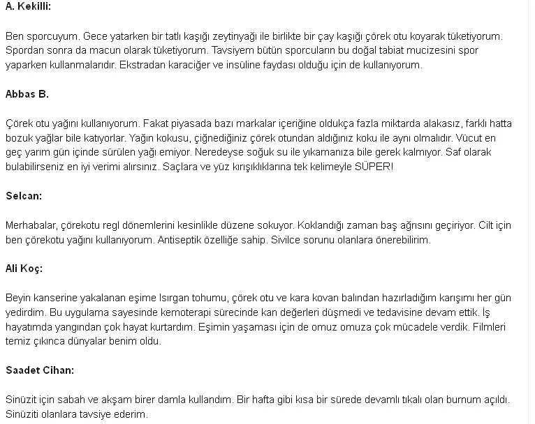 Corek otu yagindan bahsetmisinuz 2 haftadir kullaniyorum cilde uygulandigini cok bilmeden icerken yuzumede surdum . Hicbir kremin yapamadigi kadar cildimi nemli tuttu sabah surdugum yagin cildime verdigi yumusaklik aksam bile hissediliyor :)