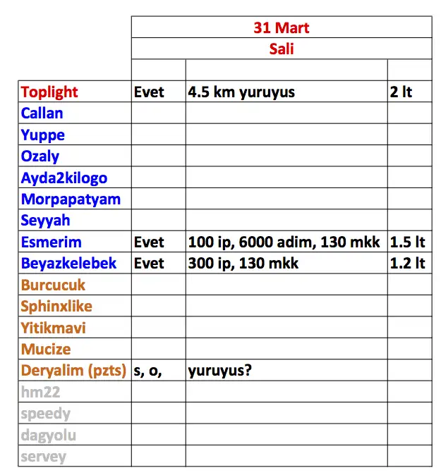 canim menulerinin eksik kisimlarini da yazarsan evet yazicam menu bildirimine, pazts ve salir aksam yemegi yok bi de spor ve su. bi kac kere arkadaslar da rica etti, aksama kadar kagit kalemle bi yere yaz, aksam menuyu topluca yaz, ya da aksam yemegini yazmaya geldiginde eski mesajlarindan kahvalti ve ogleyi de bul oraya kopyala hepsi bir yerde olsun ok?? iyi gidiyosun tatlim sadece bize kolaylik olsun diye ok :)