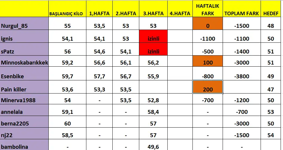 evet kızlar tablomuzda son durum budur :) turuncuyla işaretli olanlar bende dahil bu hafta kilo veremeyenler hadi bakalım yeni bir haftada gitsin kilocukla... umutsuzluk ve pes etmek yok tam gaz devam edicez