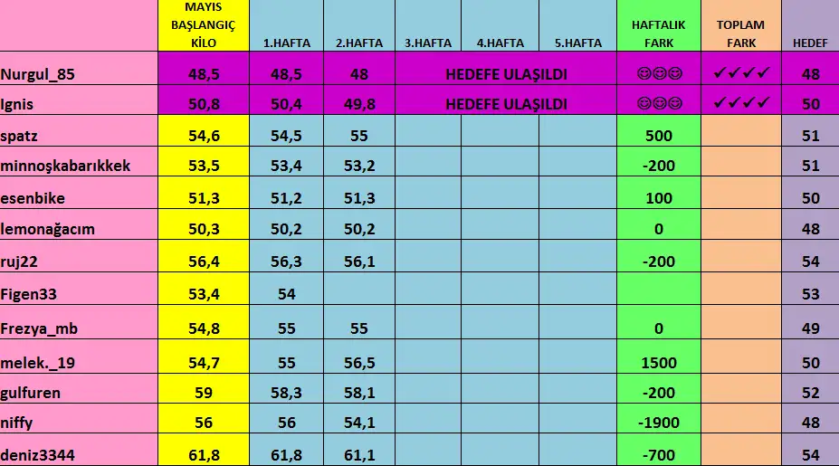 Tamam canım,her cuma bildirim yapıyoruz,başlangıç kilonu ve hedefini yaz. Şu fazlalıkları atalım artık yaza az kaldı.Öyle yapalım kesinlikle. Ben de burdan gayretle şu öğünlerimi düzelteyim sporu ekledim 25 dk video var fitness onu yapıyorum iki gündür.