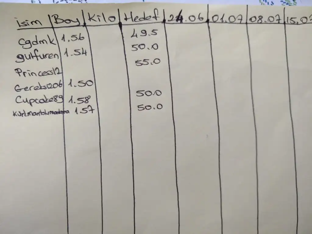 Başlangıç kilolarını ptesi eklerim diye düşündüm cok kalmadı diye ama onceden yaz derseniz geçen ptesi ya da hatirlamiyorsaniz güncel kilolarınizi yazayim.Başladığımız kiloları da yazarsan sevinirim. İlk hafta güzel kilo veriliyor. Bu bize gaz olur.Emeğine sağlık güzel olmuş.