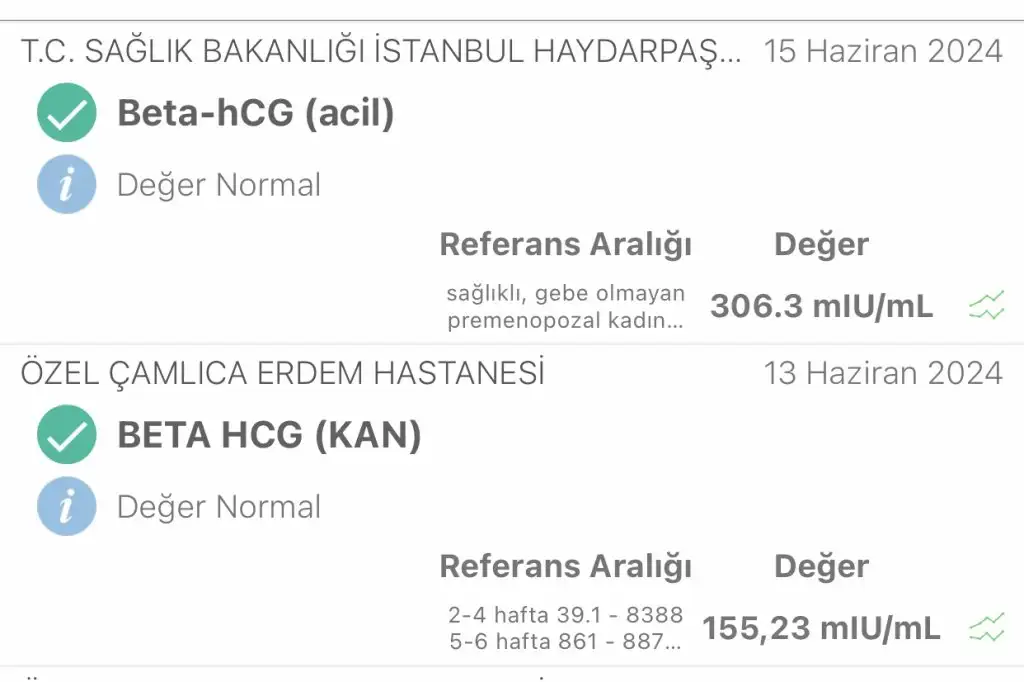 Merhaba normalde kontrolüm salı günü ama siz öyle deyince içim içimi yedi tekrar kan verdim sonucu paylaştım sizinle inşallah keseyi görürüm ve inşallah siz de sağlıklı gebelikler geçirip bir an önce bebişinize kavuşursunuzMerhaba teşekkür ederim size de hayırlı olsun güzel artmışlütfen tekrar kan verin benim de ilk iki verdiğimde çok güzel artmıştı ama sonra maalesef yavaş ve az arttı benim kendiliğinden düştü iki kere alttan bakıldı ama alttan bakıldıktan baya sonra hiç bir şey yapmazken düştü yani maalesef düşeceği varsa düşüyor yavaş ve az artan betadan böyle bişey bekliyorduk ama insan yine de üzülüyor işte inşallah sizinki sağlıklı bir gebelik olur hayırlısıyla alırsınız kucağınıza lütfen sonucunuzu bana da yazın