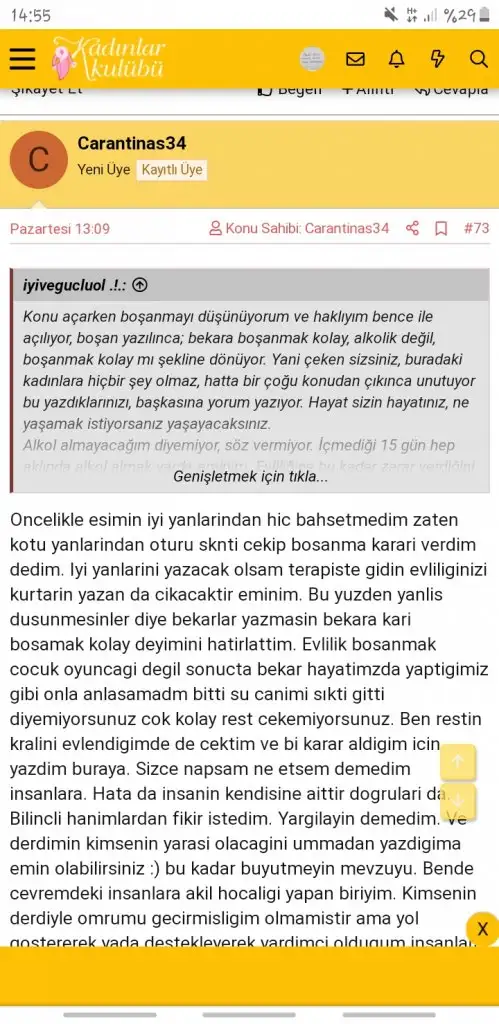 Hayatimda ilk defa byle bi travma yasadim. Esim beni seven bi adamdi ama cirkef bir tarafi hep vardi. Her zaman yapar eder ozurle kapima gelirdi. Sonunu da hep "alkolluydum ciddiye alma"ya baglardi. Evlendikten sonra sirf annesi icin bana ayip etti dedim diye icip icip nerdeyse canima kastetmesi olayi psikolojimi ruhumu alt ust etti kimle evlendim ben naptim diyorum her gun. Bu olayin pesine benden ve ailemden ozur diledi ben bosanmayi dusundugumde nerden aklina geliyo bosanmak dedi. Bi daha olmayacak dedi. Ailem dediysem sadece annem konudan haberdardi cunku babam ve abim bilseler beni asla ona bi daha emanet etmezler bide esimin onlar icin ettigi kufurlerin bana yaptiklarinin hesabini odetirlerdi. Benle konustu bidaha olmayacak dedi alkolu birakacaksin dedim kabul etmedi. Annemle konustular ona da soz verdi ozur diledi. Bi daha hata yapma luksun yok deyip eve dondum bende.