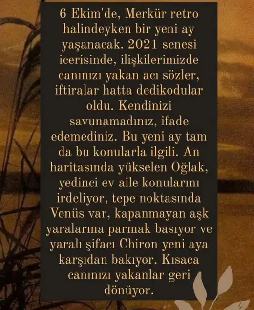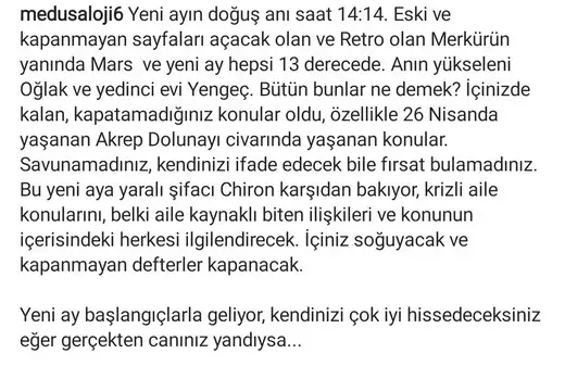 Mars'ın da etkili konumda olduğu bu yeniayda, daha mücadeleci olacağız. Merkür'ün de retro dönemde olduğu bu zamanda ilişkilerde geri dönüşler, değişimler veya yeniden geri kazanmak için telafi isteği artabilir. Dengeli, samimi iletişimin ön planda olacağı bu yeniayda eski dostlarla aranızı kapatabilirsiniz. Ancak ilişkilerde sınırları aşmamak, gerektiğinde hayır diyebimek gerekiyor. Aksi durumda aynı kayıpları yeniden yaşayabilirsiniz.